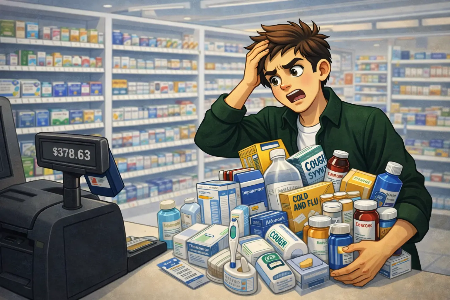 After that, I went to the closest drugstore for a shopping spree: painkillers, anti-inflammatory medicine, thermometers, and everything else that might be needed. Since she hadn’t been sick for a couple of years already and I wasn’t a flirtatious medical sales rep with a whole medicine cabinet in the trunk of his car, almost everything had to be bought new.
